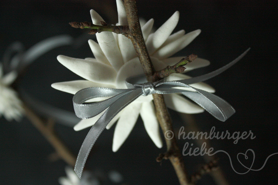 Durch die Rose habe ich hinten ein Loch mit einem Zahnstocher gebohrt. An die Dahlien-ähnlichen Blüten habe ich hinten mit einem Schnippselchen Stylefix ein graues Satinband geklebt. Das hält prima, denn die Blüten sind federleicht. So konnte ich sie mit einer Schleife an den Zweigen festbinden.