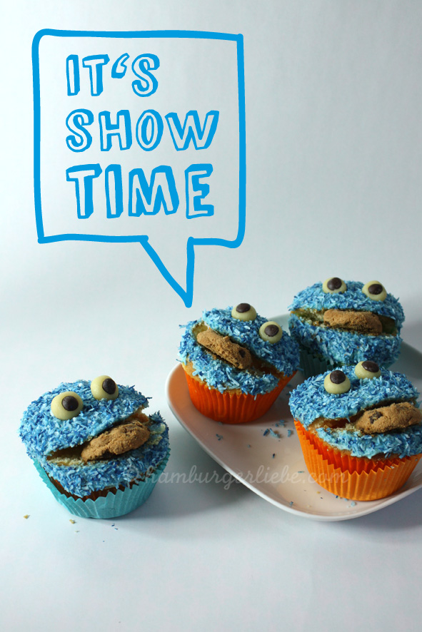 Zu machen gehen sie ganz leicht. Man bäckt einfache Muffins, hell oder schokoladig im Teig. Sind sie abgekühlt, werden sie mit Zuckerguss oder einem Frosting à la Cynthia bestrichen und in Kokosflocken getunkt, die man vorher mit Lebensmittelfarbe färbt (einige Tropfen Farbe auf die Flocken und gut vermischen). Für das Frosting habe ich Butter, gesiebten Puderzucker und Zitronensaft mit ein paar Tropfen Lebensmittelfarbe mit dem Mixer verrührt. Dann schneidet man die Muffins ein und steckt einen Keks ins Mäulchen – aber bitte nur original Chocolate Chip Cookies, denn die sind die absoluten Lieblingskekse von Krümelmonster! Die Augen sind kleine Marzipankugeln mit einem Schokotröpfchen in der Mitte. Ins Kokoskrümel-Frosting-Topping drücken – fertig.