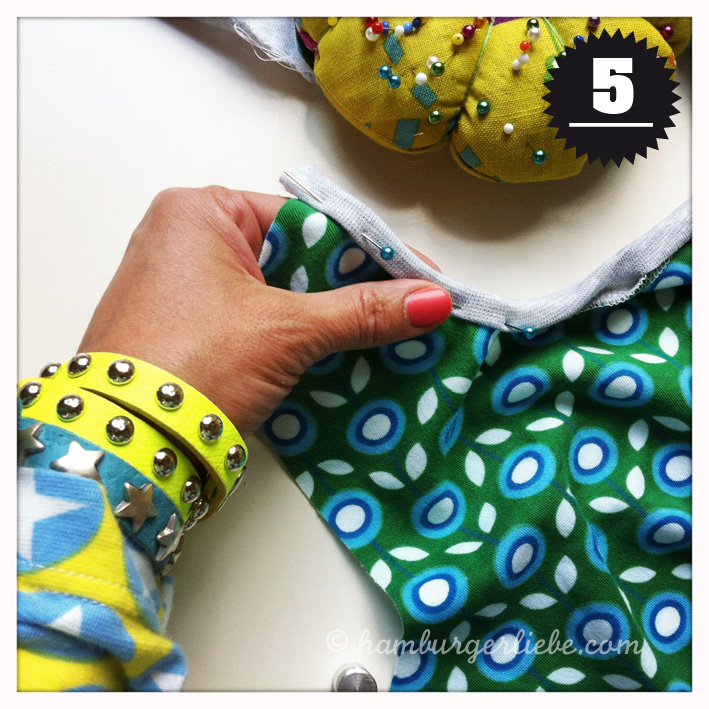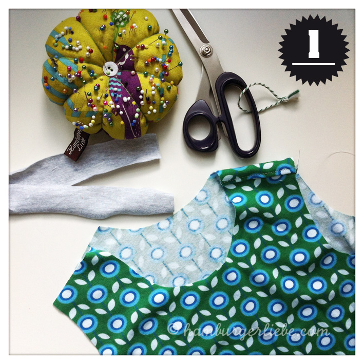 9. Beginnt am besten an der äußeren Seite der Schulternaht und lasst eine „Nahtwurst“ überstehen, die ihr dann mit einer Stopfnadel in der Naht verschwinden lassen könnt. So trennt sich am Kragen später nichts auf.