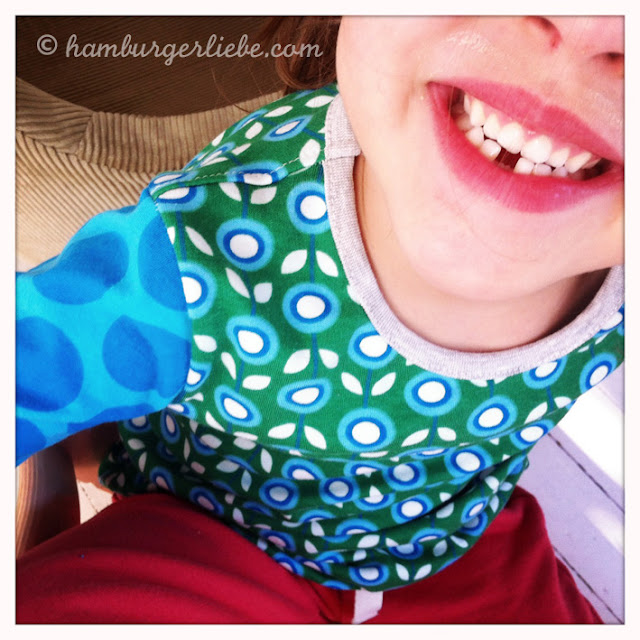 Ich hab gleich drei Shirts (hier Schnitt Klein Fanø) zugeschnitten, damit ich nicht so oft umbauen muss (Cover – Overlock – Cover – Overlock...). Diesmal schon mit langem Arm, denn den Glauben an den Sommer im Norden habe ich bereits verloren.