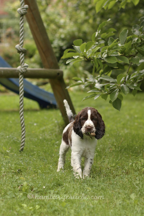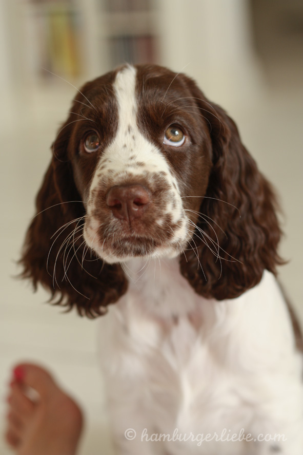 Am Sonntag sind wir die lange Strecke wieder zurück gefahren. Glückseelig, trotz gleisender Hitze, Stau und Autobahnvollsperrung. Im Gepäck hatten wir nämlich Polly. Polly ist eine fast 10 Wochen alte English Springer Spaniel Hündin und seit drei Tagen rockt sie hier die Bude. Und wir sind alle total verknallt. Bei dem Blick – wen wundert das?