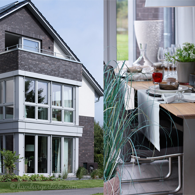 Der vorgebaute, zweistöckige Erker schafft nochmal zusätzlichen Platz und beherbergt im Erdgeschoss den Essbereich. Überhaupt ist unten alles schön offen und großzügig, so hätte ich das auch gern. Wohnzimmer, Küche und Essplatz sind quasi eins und der Mittelpunkt des Familienlebens. Die bodentiefen Fenster machen alles schön hell und die Terrasse – welch ein Luxus – läuft einmal außen herum. So kann man schön im Sommer mit seinem Kuchen und Eiskaffee der Sonne folgen und am Ende der Terrasse mit einem Grillwürstchen abschließen.