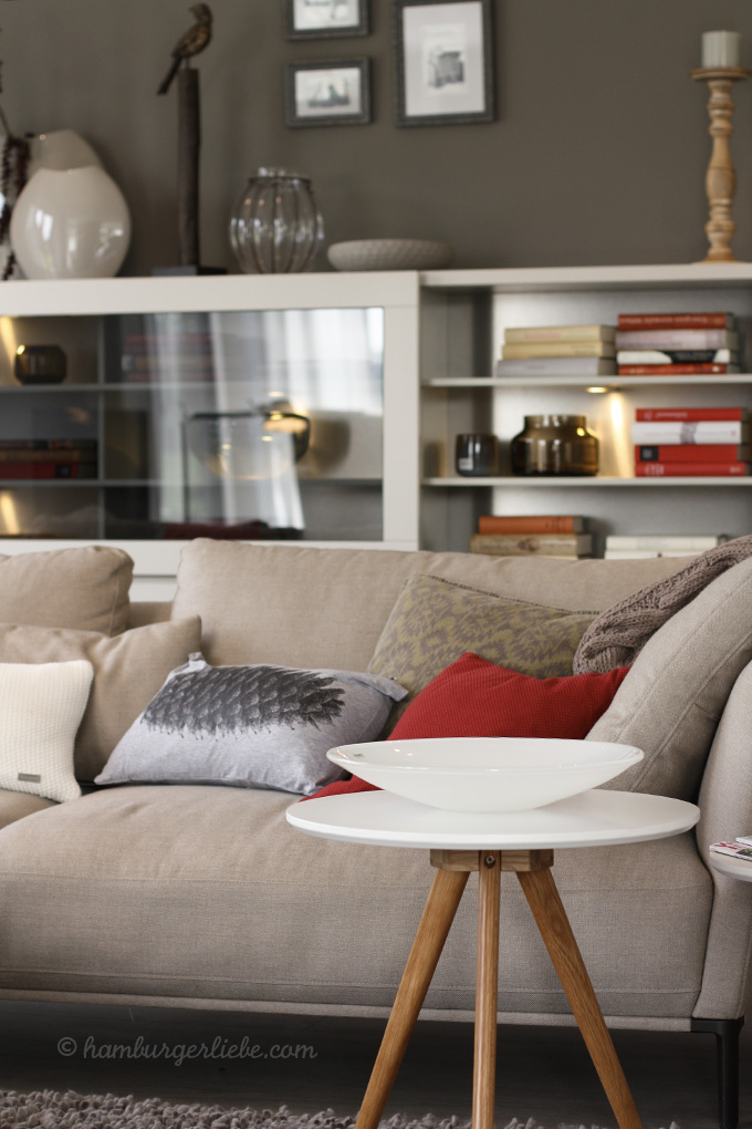 Das Sofa steht im Wohnbereich mitten im Raum und bietet so weiteren Stauraum an der Wand. Eigentlich ist das viel hübscher, als wenn immer alles so an die Wand geschoben wird. Der Platz davor ist trotzdem noch reichlich und gemütlich, so mit dem dicken Puschelteppich und dem Kaminofen.