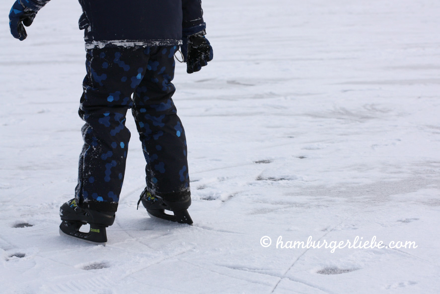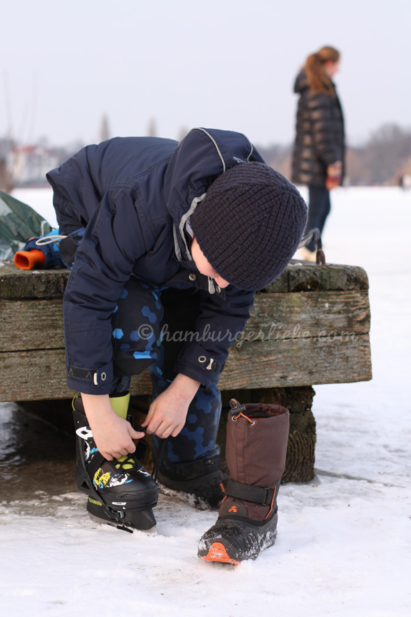 Gestern haben wir etwas ganz besonders schönes gemacht. Ich habe einfach mal die Arbeit Arbeit sein lassen, den kleinen Glücksritter früher aus dem Hort eingesammelt und bin zusammen mit ihm und seinen Schlittschuhen in unser altes Revier an die Alster gefahren. Die ist nämlich vor lauter Affenkälte in Schockstarre gefallen und das kommt nicht allzu häufig vor. Dick genug sei das Eis um einen Fuß darauf zu setzen oder auch zwei, aber bitteschön auf eigene Gefahr. Gerne doch!