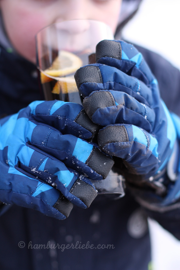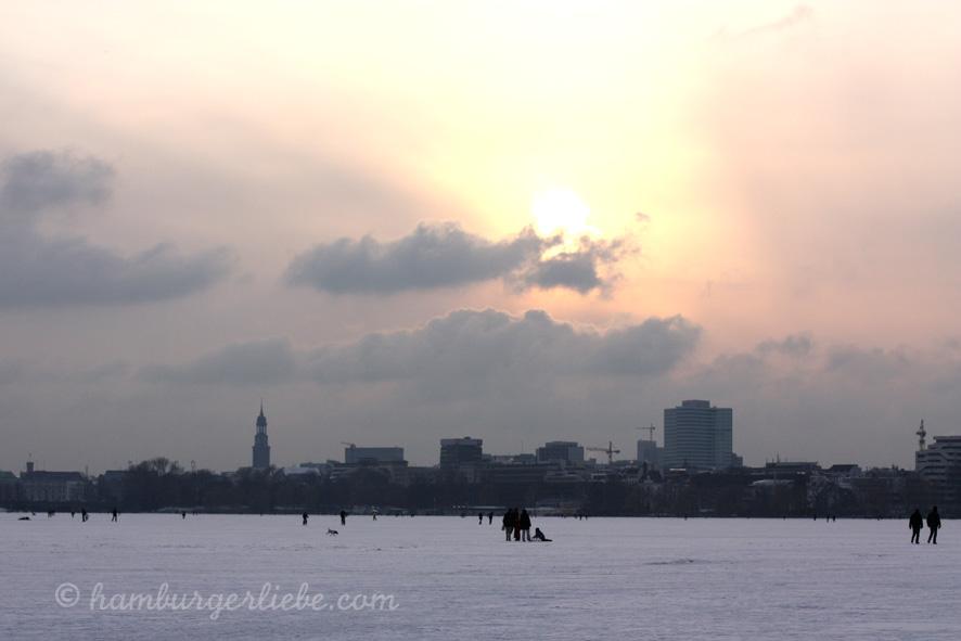 Auf der anderen Seite legen wir einen kleinen Boxenstopp an der Alsternperle ein, wärmen uns die steifgefrorenen Finger an Punsch und Kaffee und betrachten verzückt die Sonne, die hinter Schleierwolken einen letzten verklärten Bick auf die große Eisfläche wirft.