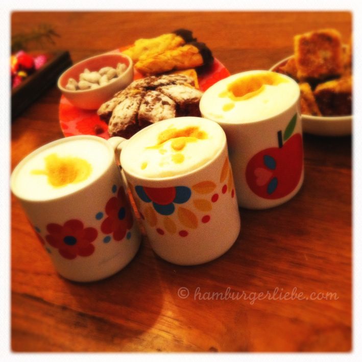 Die wunderhübschen Kaffeebecher von Frau Jolijou hübschen unser Weihnachtskaffeetafel auf – in echt noch viel schöner als im Schummerwinterkerzenlicht. Der Christbaum erstrahlt in hellem Glanze.