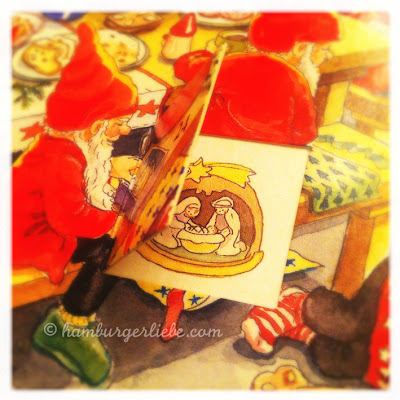Also machen wir es uns die letzten Stunden vor dem Fest noch mal gemütlich, denn die Geschenke sind gepackt und überhaupt bringt die bei uns der Weihnachtsmann – wozu also stressen? Wir blättern noch mal in dem neuen Weihnachtswimmelbuch Fröhliche Weihnachten mit den Weihnachtswichteln von Sabine Scholbeck mit den Wichteln Bolle, Lars, Rasmus, Pelle und Knut (der mit der Brille) und spielen niemals müde immer das gleiche Spiel: Wer findet zuerst den/die/das...? Herrlich!
