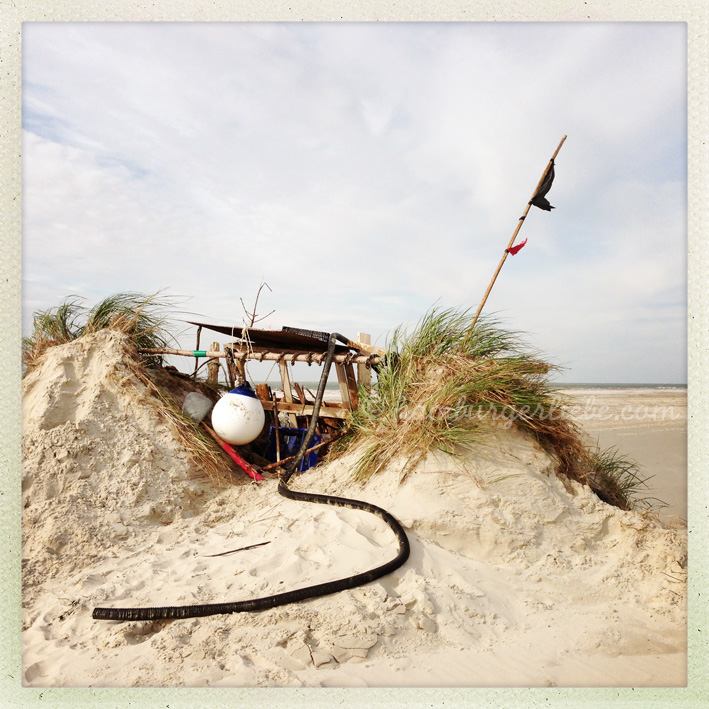 Hier hat sich jemand aus Strandgut einen behaglichen Windschutz gebaut. Für Kinder und Hund gleichermaßen spannend.