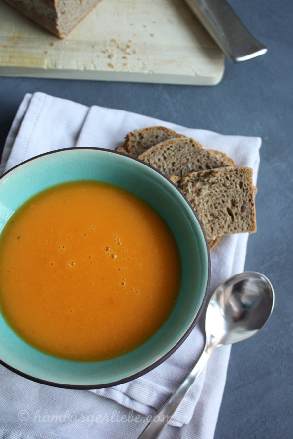 Wer es gern sämig mag – und ich finde, im Winter muss man wirklich keine Kalorien zählen – gibt noch einen Klecks Schmand dazu. Eher keine Sahne, denn die flockt durch die Säure der Orangen aus. Dazu eine dicke Scheibe getoastetes Schwarzbrot mit Butter – der Himmel auf Erden. Und die Suppe zündet nicht nur optisch ein kleines Feuer an. Wenn's da mal nicht warm wird im Bauch...