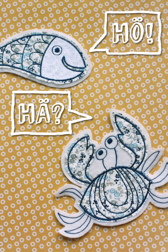 Na, das hat ja gerade noch gefehlt! Genau – neues (Fisch)Futter für die Stickmaschine. Viele von euch haben schon danach gefragt, wann denn endlich die Datei passend zu den Stoffen kommt. Einige von euch haben aber bestimmt auch schon bei Frau Superduperturbo-Lilalotta einen ganzen Fischschwarm entdeckt oder auch bei Frau Kännchens neuer Leidenschaft (Schlafanzüge für die ganze Familie nähen) geluschert.