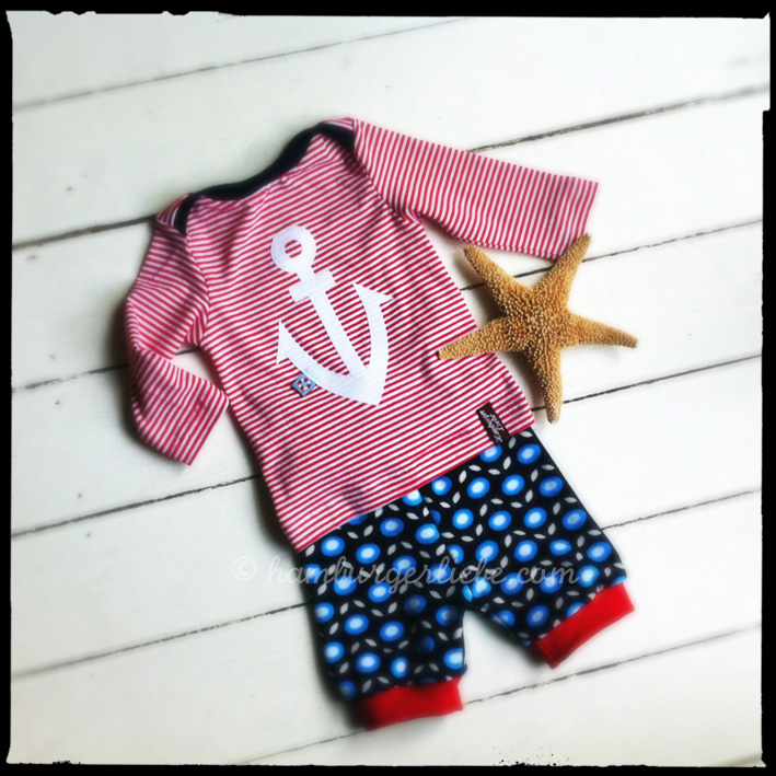 Ich zeige euch mal noch ein paar hübsche Frottee-Schnittchen der letzten Tage: hier eine süße Matrosen-Kombi für eine lütte Deern. Shirt und Hose sind aus der Ottobre 3/2011. In den Dreiviertelarm muss sie allerdings noch reinwachesen.