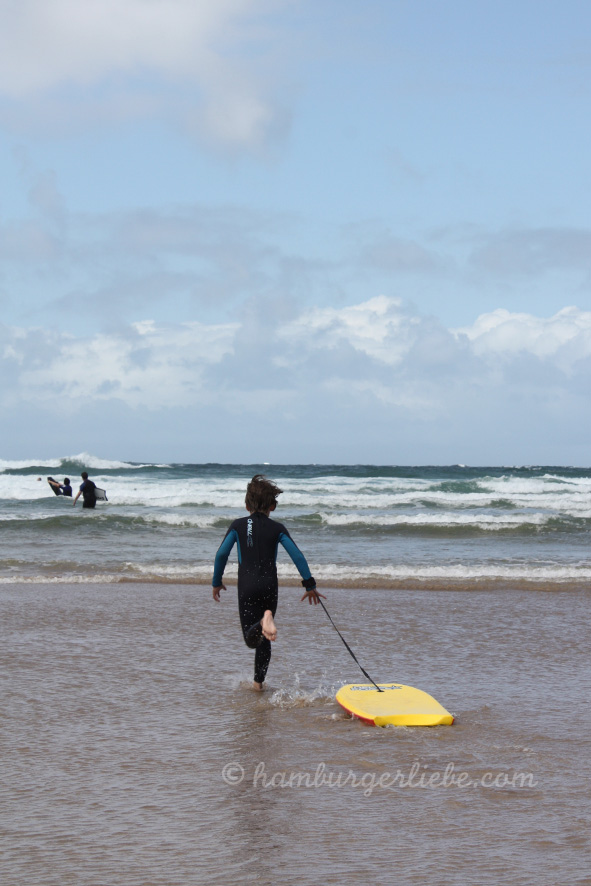 Ok, dann staden wir eben bei einer steifen Brise, nass von oben und von unten, im Regenmantel und mit Gummistiefeln in der Bucht und sahen dem Nachwuchs zu, wie er sich sich im tosenden Atlantik bei wohligen 12-14°C mit dem Bodyboards purem Vergnügen hingab. Alles eine Frage der Einstellung.