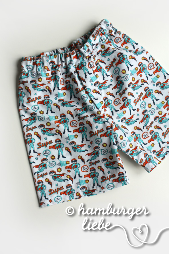 Ich wollte unbedingt so coole Boxershorts für untendrunter nähen und hab damit scheinbar total den Nerv meines kleinen Stylingexperten getroffen. Auf der Suche nach einen passenden Schnitt bin ich über den Machmalhalblang-Schnitt von Farbenmix gestoßen, der schon eine ganze Weile unentzippt in meinem E-Book-Ordner schlummerte. Einfach ein bisschen kürzer und ohne Nahtzugabe zugeschnitten, gibt das genau die richtige Passform für eine coole Unterbüx.